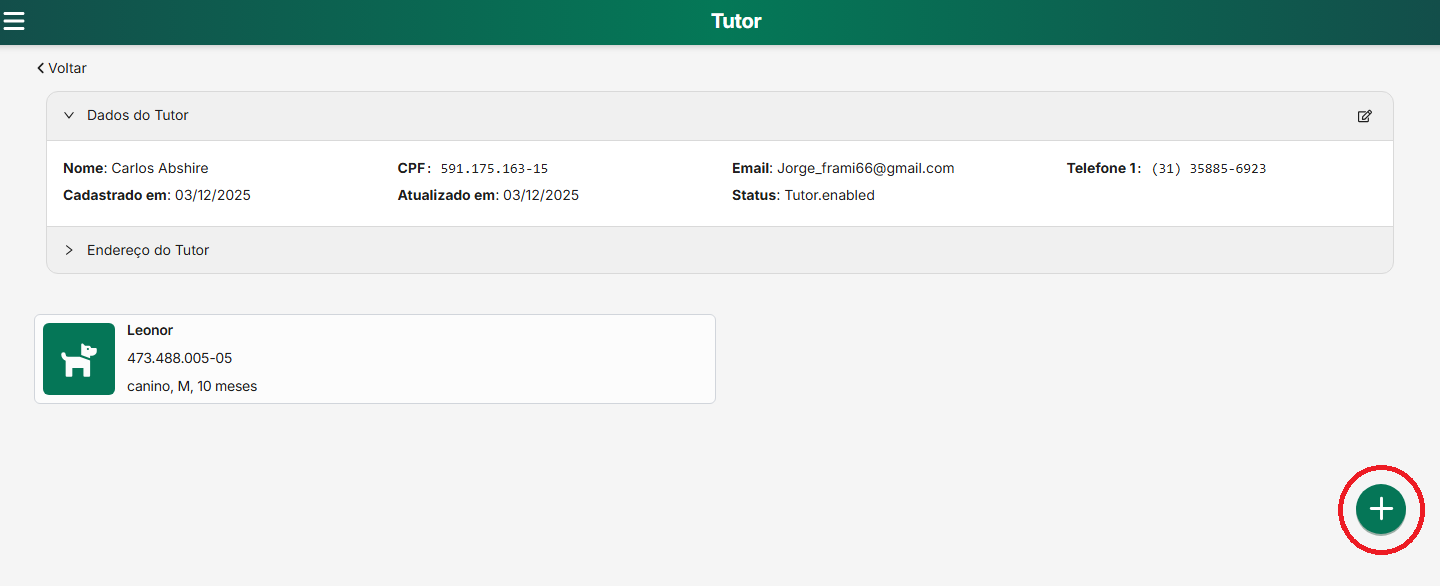 - Essa tela lista todos os animais cadastrados que são vinculados ao tutor. Clique no botão para adicionar um novo animal para esse tutor.