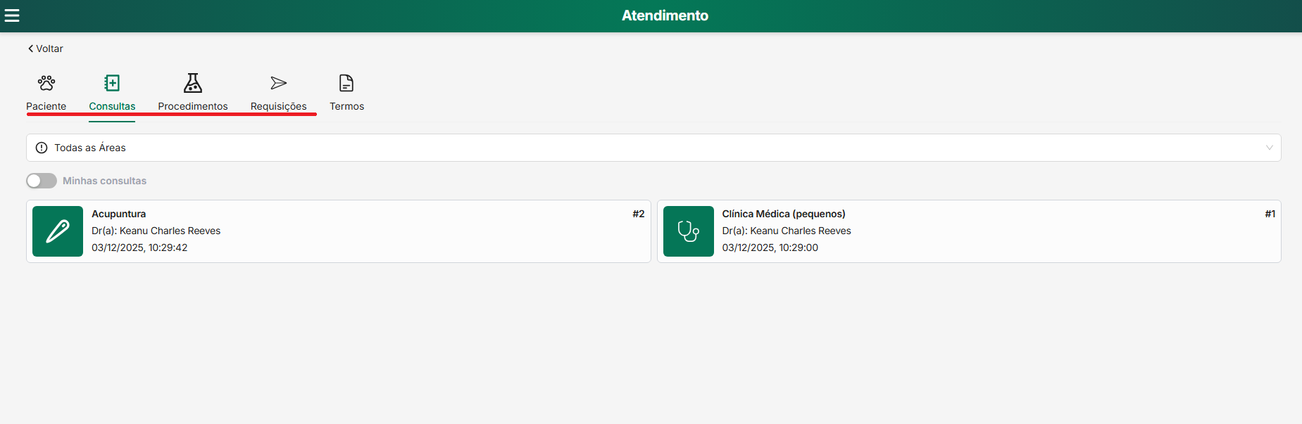 As requisições estão integradas ao registro da consulta e incluem exames, procedimentos e solicitações internas.