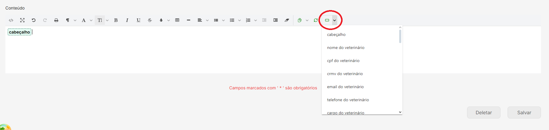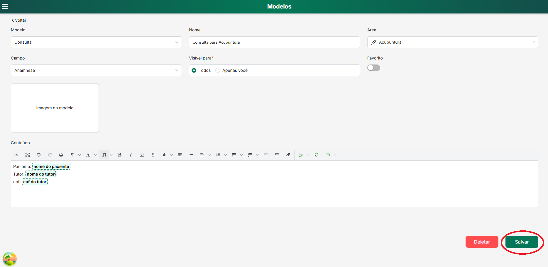 Ao criar ou editar um modelo, é possível inserir tags personalizadas. Essas tags são substituídas automaticamente pelos dados reais quando o modelo é utilizado em uma consulta ou procedimento.