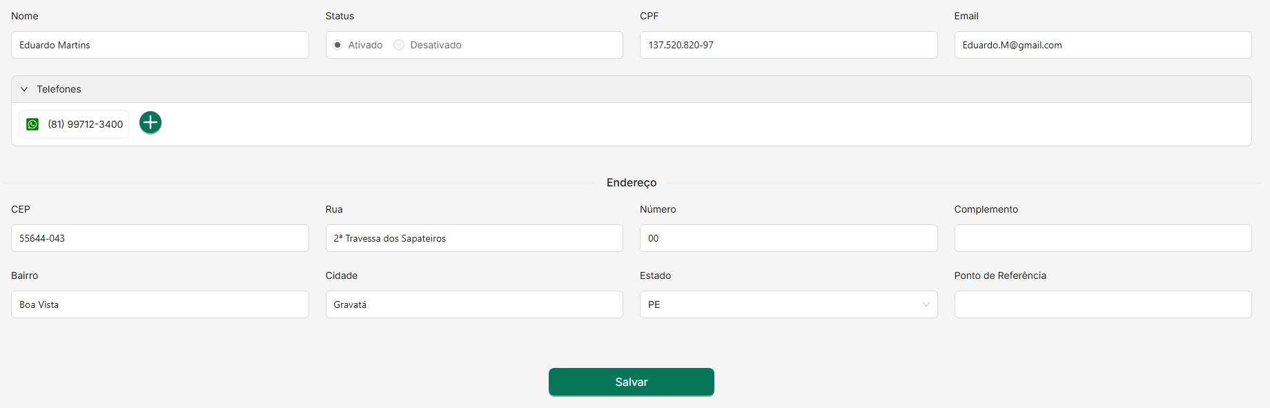 Preencha os dados básicos (nome, CPF, e-mail, telefone e endereço) e salve.